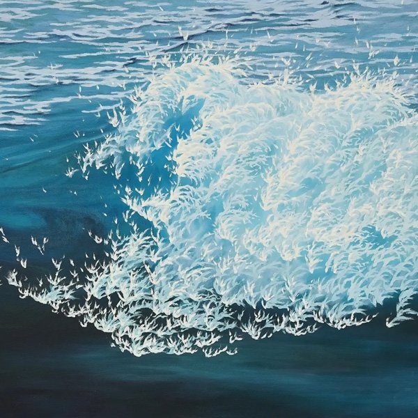 Son style oscille entre figuration et abstraction. Le rythme de ses compositions picturales séduit. Elle capture l’esprit de l’eau sans jamais la figer. C’est une prouesse technique assez remarquable.